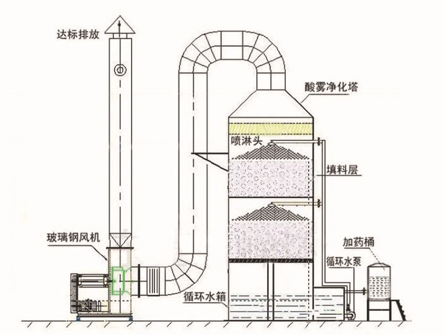 噴淋塔為實(shí)施噴淋法治理廢氣或回收原料的重要組成設(shè)備,故又稱為水洗塔、洗滌塔、凈化塔。根據(jù)廢氣類別及噴淋液的不同可分為水噴淋塔、酸噴淋塔、堿噴淋塔、油噴淋塔、水膜除塵/濕式除塵器;按形狀也可分為立式洗滌塔、臥式洗滌塔;按材質(zhì)又為分PP洗滌塔、玻璃鋼洗滌塔等。 噴淋塔運(yùn)行方式是不斷將酸霧廢氣由風(fēng)管引入凈化塔,將廢氣與氫氧化鈉吸收液進(jìn)行充分接觸吸收中和反應(yīng),酸霧廢氣經(jīng)過凈化后,再經(jīng)除霧板脫水除霧后由風(fēng)機(jī)排入大氣。吸收液在塔底經(jīng)水泵增壓后在塔頂噴淋而下,之后回流至塔底水箱內(nèi)如此進(jìn)行循環(huán)使用。凈化后的酸霧廢氣可以達(dá)到地方排放標(biāo)準(zhǔn)的排放要求,也會(huì)低于國家排放標(biāo)準(zhǔn)。
