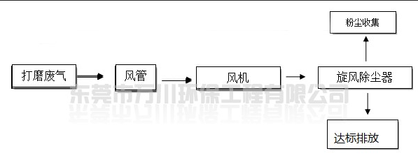 二樓的切削打磨屬于粉塵廢氣,打磨拋光時所產(chǎn)生的粉塵通過收集由引風(fēng)機(jī)抽至車間外。本方案設(shè)計(jì)設(shè)粉塵廢氣處理系統(tǒng)二套,處理能力為15000m3/h,系統(tǒng)設(shè)于車間一樓。