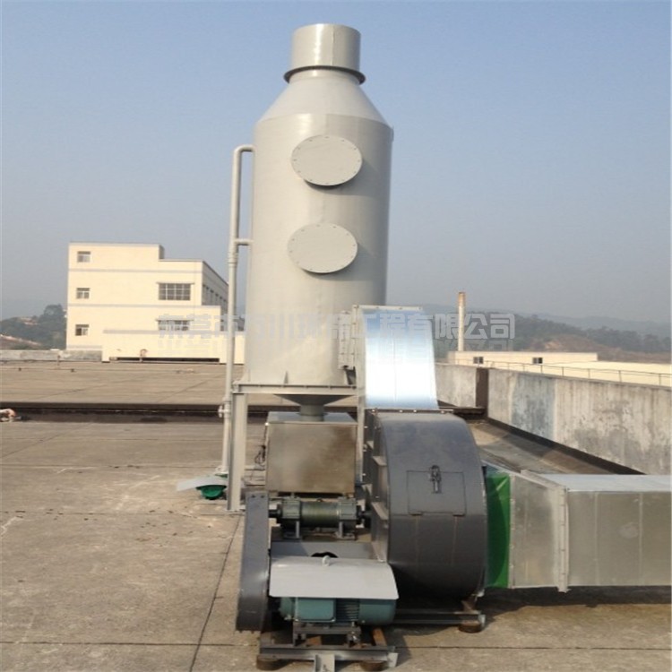 含塵廢氣在風(fēng)機的作用下,含塵氣體從塔體下方進氣口沿切向進入濕式除塵器噴淋塔,在風(fēng)機的作用下,迅速充滿進氣段空間,然后塔頂位置的噴淋頭向下噴水,水與含塵廢氣接觸,使得空氣和粉塵分離,達(dá)到除塵的效果。濕式除塵器噴淋塔具有結(jié)構(gòu)簡單、造價低、占地面積小、凈化效率高等優(yōu)點,能夠處理高溫、高濕的氣流,將著火、爆炸的可能減至最低。