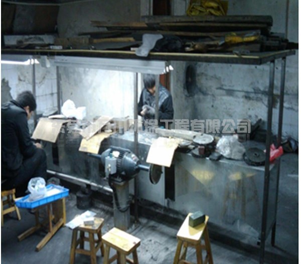 粉塵通過風(fēng)機(jī)產(chǎn)生的負(fù)壓經(jīng)打磨臺正面下側(cè)吸風(fēng)口進(jìn)入打磨臺,大顆粒粉塵與內(nèi)板碰撞后,受重力的作用下落入集灰抽屜,細(xì)小顆粒的粉塵沿風(fēng)口上升到集塵管道,最后進(jìn)入粉塵處理設(shè)備,經(jīng)有效處理后高空排放。