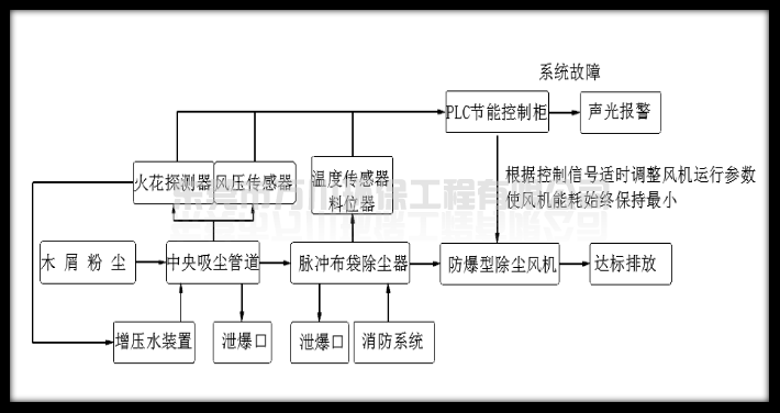 2)風(fēng)機(jī)在除塵器末端,避免木料中的金屬物通過(guò)管道直接吸入風(fēng)機(jī)中,將與風(fēng)葉摩擦的火花吹進(jìn)布袋除塵器中,導(dǎo)致安全隱患。