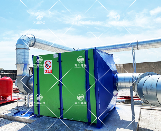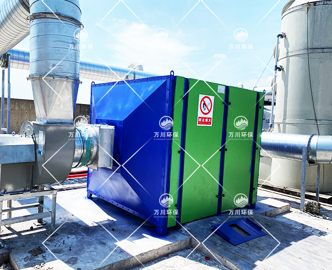 橡膠廢氣從管道進(jìn)入到設(shè)備內(nèi),穿過(guò)第一層噴淋層,用水沖洗廢氣,再進(jìn)入到第二、第三層填料層,去除水溶性的粉塵和廢氣,最后進(jìn)入到活性炭吸附層,利用活性炭的吸附力,吸附有機(jī)廢氣,達(dá)到凈化的效果。